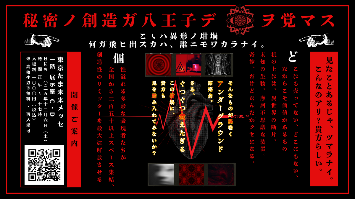 アンダーグラウンド・サブカルチャーに特化した展示即売会として、個性溢れる多彩な表現者たちが全国から集結し、創造性のリミッターを解放させる一日限りのイベントです。