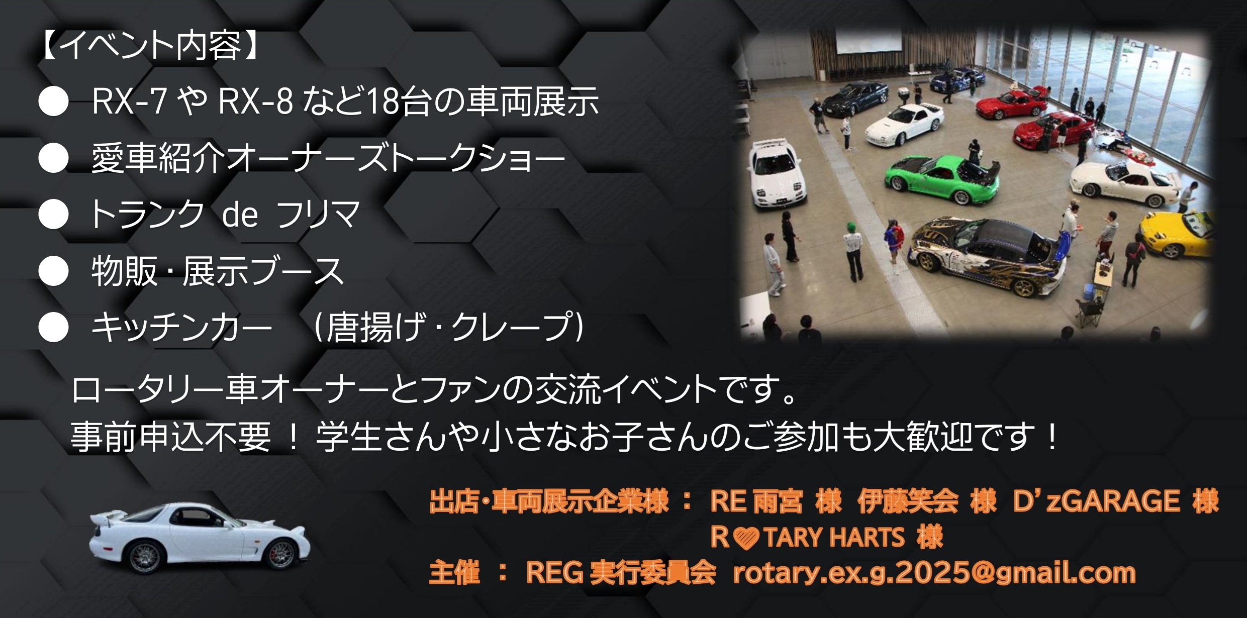 ロータリーエンジン搭載車をこよなく愛す現オーナーや、将来「ロータリーに乗りたい」という未来のオーナーが集う交流イベントです。歴代の名車を眺めながら、アットホームな空間でロータリーへの想いを語りませんか。