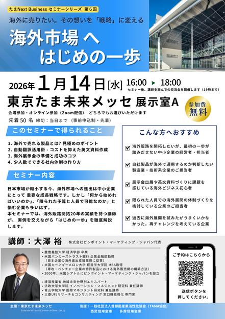 東京たま未来メッセでは、海外展開を検討する中小企業の皆様を応援するため、「たまNext Businessセミナーシリーズ」を開催しています。その第6回として、海外販路開拓の「はじめの一歩」をテーマにしたセミナーを実施します。