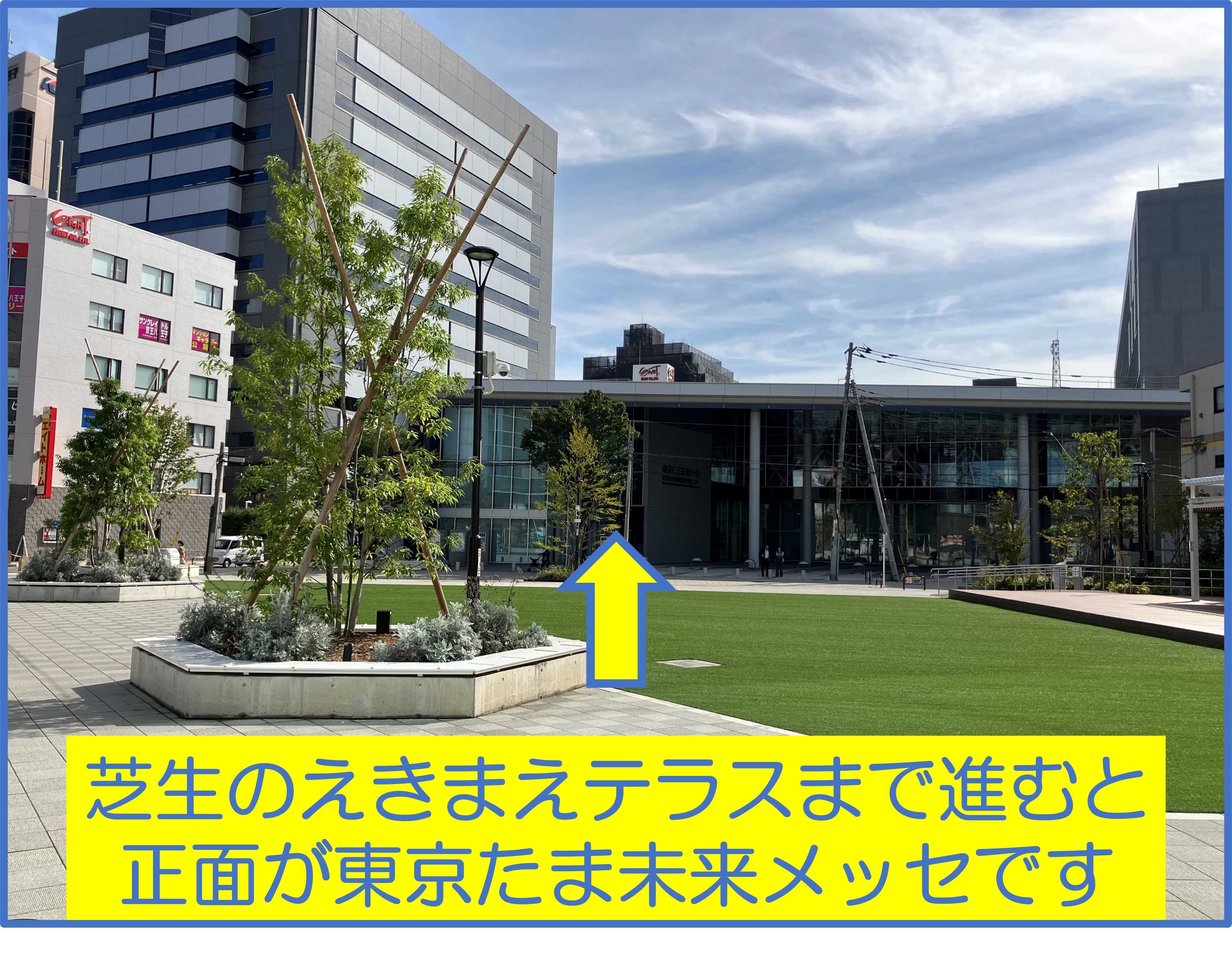 ★そのまま歩道を直進し、右手のファミリーマートやセブンイレブンを通り過ぎ、芝生の広場がある「えきまえテラス」まで進むと、正面に【東京たま未来メッセ】が見えます。「保健所前」交差点のすぐ横です。